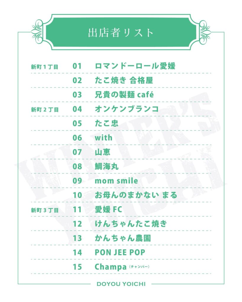 ロマンドーロール愛媛/たこ焼き合格屋/兄貴の製麺café/オンケンブランコ/たこ忠/鯛海丸/with/山恵/mom smile/お母んのまかないまる/愛媛FC/けんちゃんたこ焼き/かんちゃん農園/PON JEE POP/Champa/富士写真館/riri.and K/glamorous coffee/焼き鳥 KUUKAI/F.O.G pizzahouse/petit bonheur/WILL/momo cafe/coffeeとツナグ/おこのみかふぇ MoCo/ポンエペレ/都築鮮魚店/肉のエンターテイナーHANAGA/骨付鳥つぼ屋/ミスタードーナツ …ほか多数!